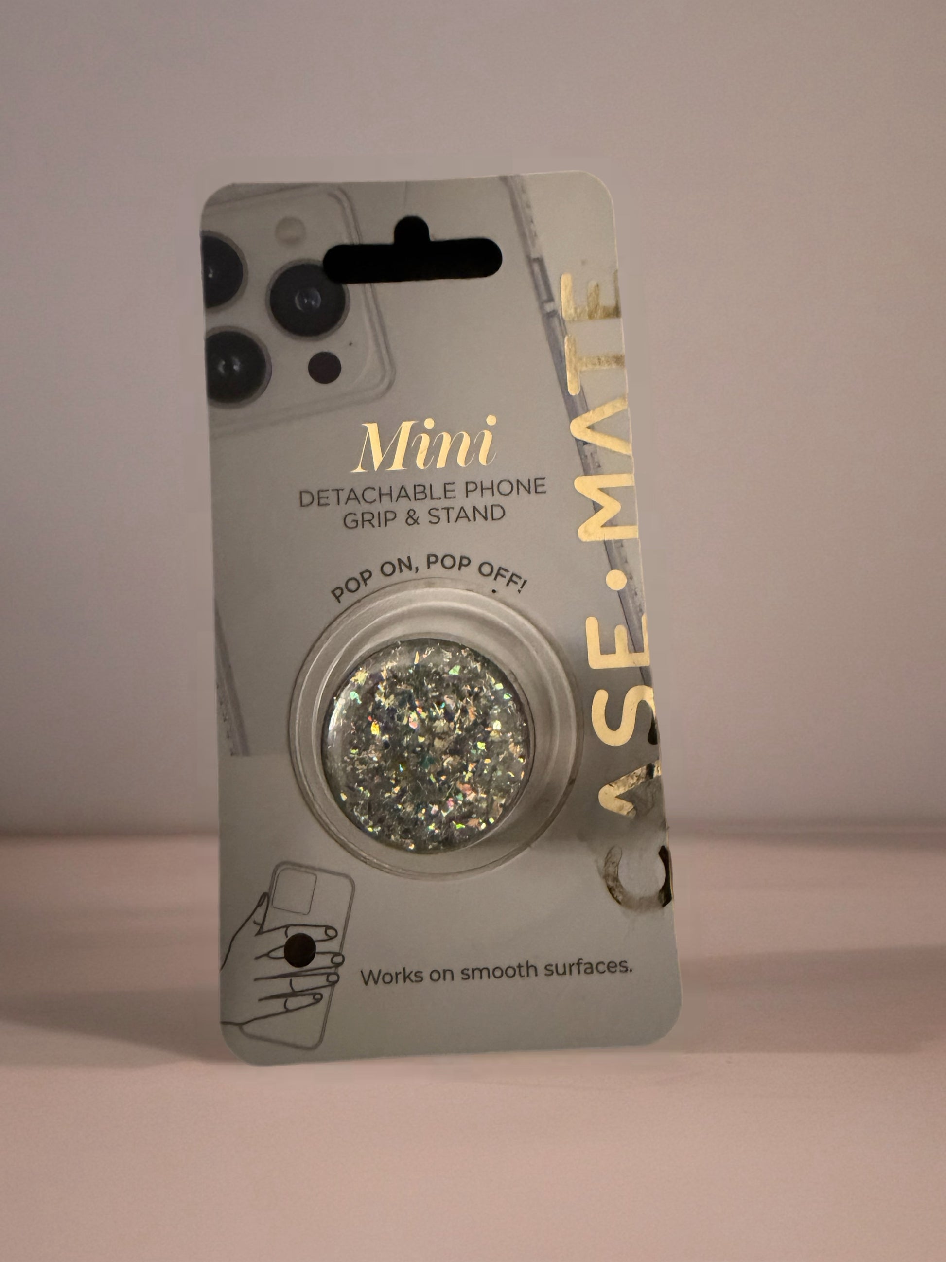 Enhance your phone’s functionality with the Mini Silver Glitter Grip Stand. This compact accessory provides a secure hold for one-handed use and doubles as a convenient stand for hands-free viewing. Its shimmering silver glitter design adds a touch of elegance while maintaining a slim profile that won’t bulk up your device. Ideal for improving grip, preventing drops, and enhancing comfort during extended use.
